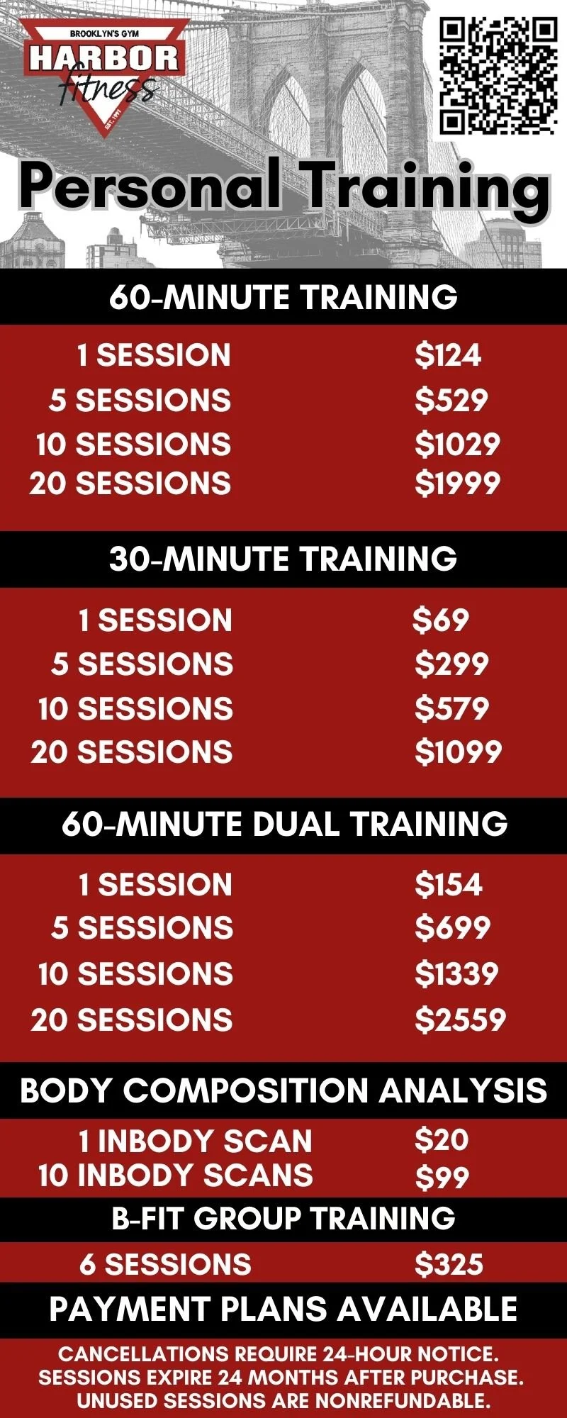 Upon joining Harbor Fitness you will receive one 60 minute, one on one, complimentary training appointment. You will be able to discuss your goals with a certified personal trainer who will then lead you through an assessment and complete workout.